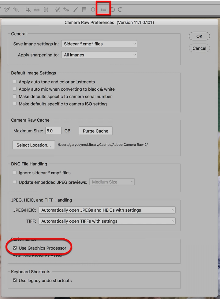 Otherwise, if you need to see where to turn off your graphic processor see below. If you click on the "bullet list" in the top part of ACR, that opens up the ACR prefs. Than lower (where the round-corner Rectangle is) is the checkbox to turn off the Graphics Processor is