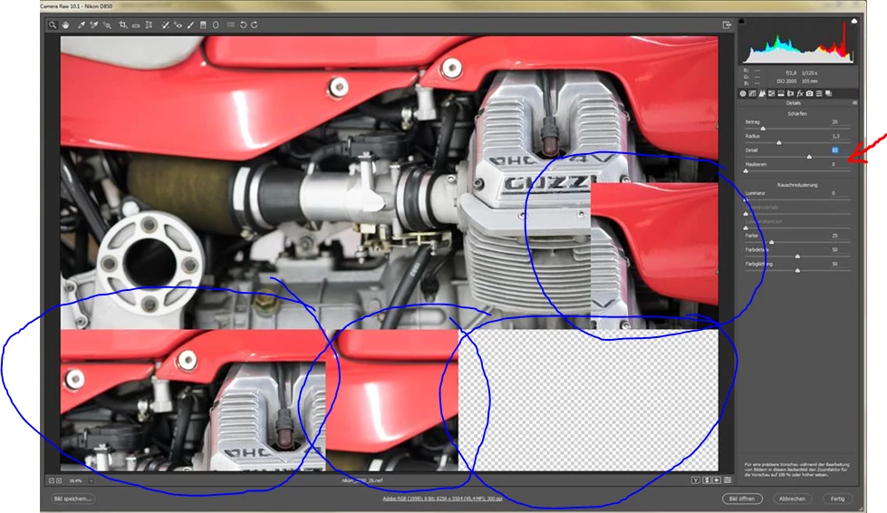 Wenn ich im Camera RAW ein Datei (NEF / CR2...) öffne, und versuche, das Bild zu bearbeiten (z.B. den Schärferegler verschiebe) bricht das Bild im Vorschaufenster ständig zusammen, flackert auf oder wird kurz falsch dargestellt (siehe Beispielfoto). Es betrifft nur das Vorschaubild. Menüs und Rahmen usw. flackern nicht.
