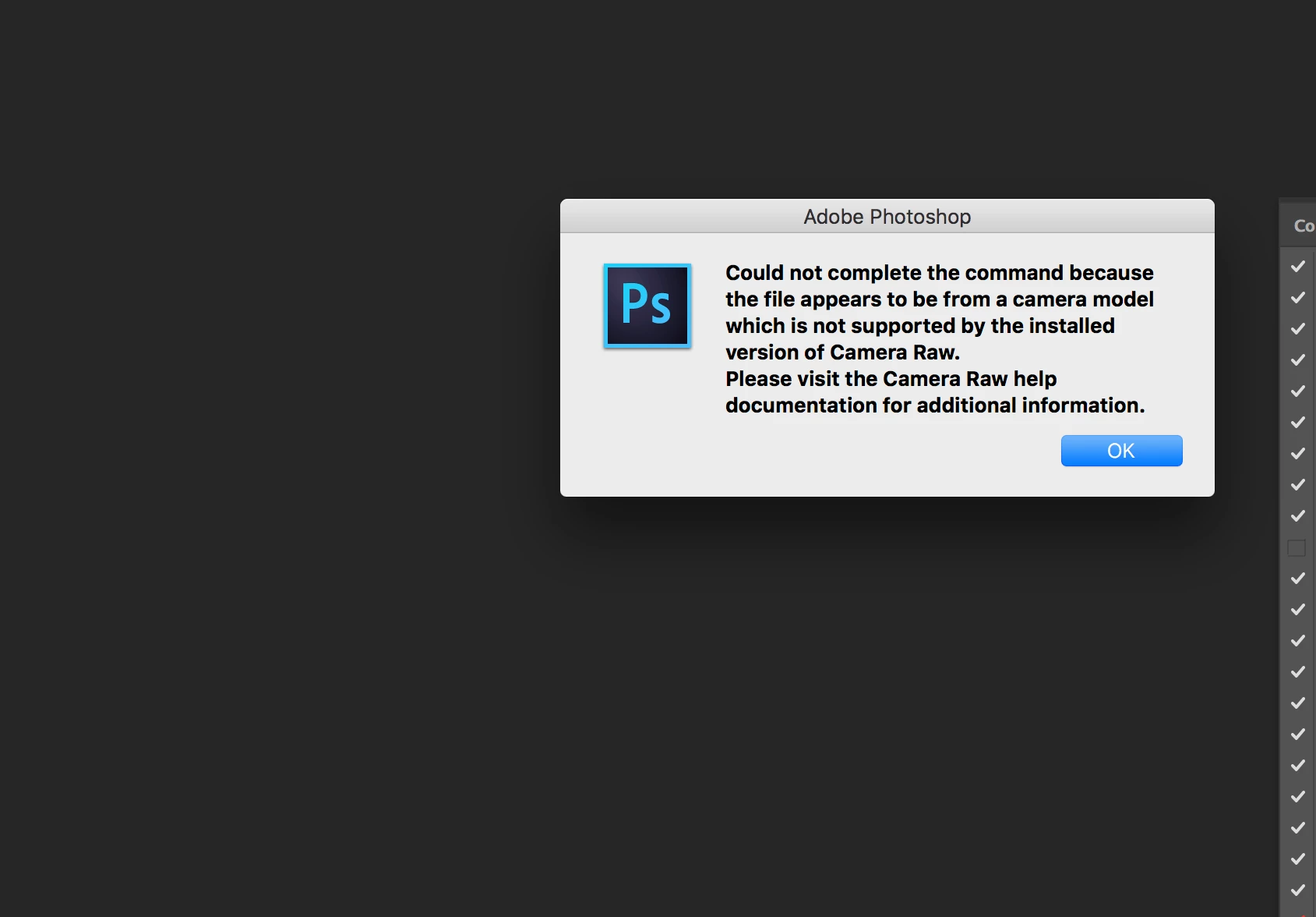 I'm getting this error message (pictured) and just 1 hour ago it was working fine. I have not gotten a new camera. I went and downloaded the "update" for camera raw and when I opened the installer it said I didn't need it. I am simply trying to just open my raw files in photoshop to work. Don't understand what happened!