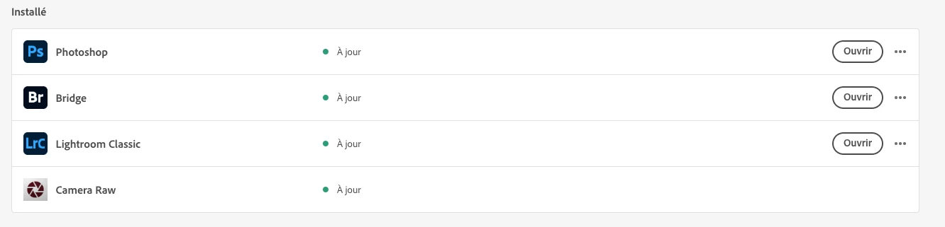 On the screenshot below I have an Open icon for other Adobe applications, but not for Camera Raw.