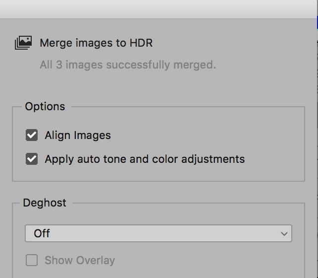 I receive the message that all 5 images have been successfully merged. Align images and Apply auto tone and colour adjustments are both selected.