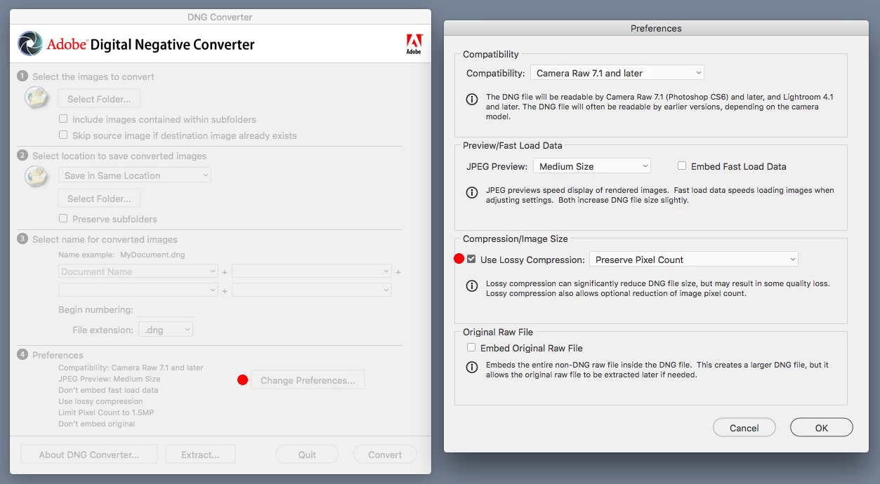 But.. then I follow the exact same procedure and try to save the files as DNG's.. they save out as the original size.