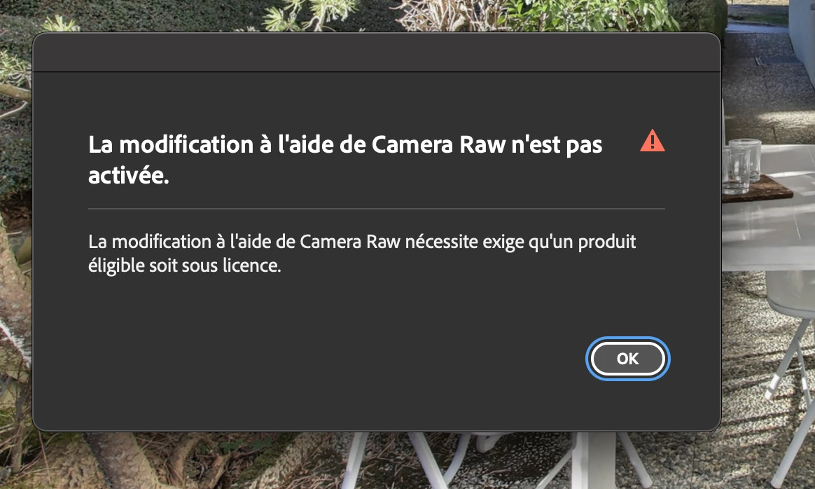 I have been using Camera Raw from Bridge very often, and all in a sudden this message pops up when I launch it and it wont launch. Below in the picture in French, it says "The modifiation with Camera Raw requires that an eligible product be under licence."