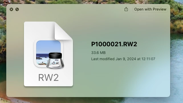 BUT I just purchased a Lumix S5iiX also using RW2 files for their RAW and I cannot see them at all in Finder/Preview. I can see the image in Photoshop or Lightroom but NOT in Finder/Preview and I use this all the time to quickly look at an image.