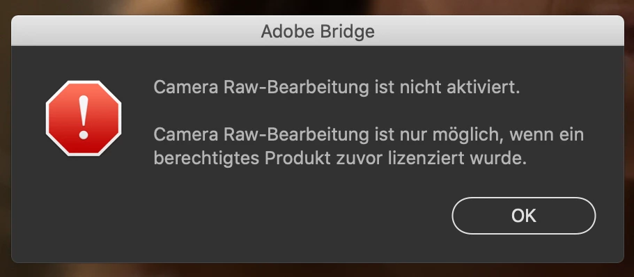 My problem is that I cannot start ACR from within Bridge. I always get the attached error message. I've already tried logging out and logging back in to Adobe. I also restarted my Mac. All programs can be started and ACR also starts from Photoshop. All programs are up to date. The problem has existed since I also booked indesign with my photo subscription. I'm working on an iMac 5k.
