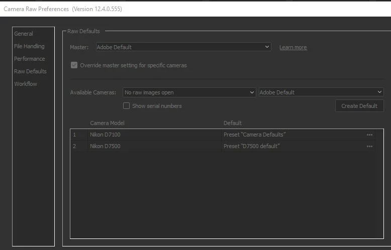 Cannot apply camera RAW defaults with camera RAW 12.4