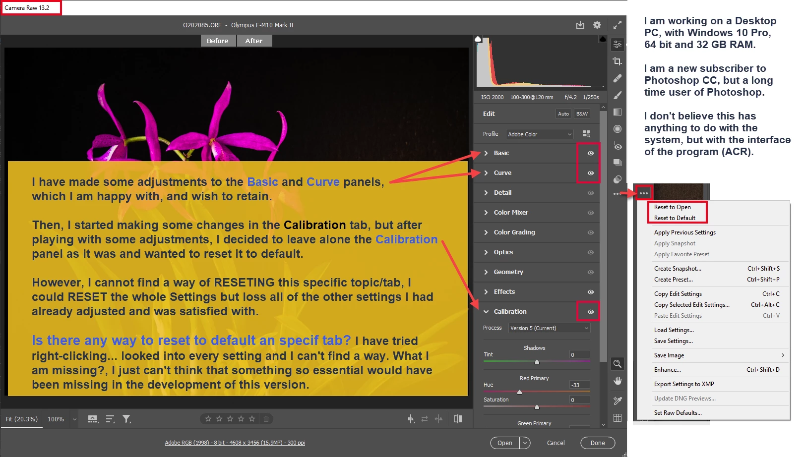 Hello members, I am a recent subsriber of Photoshop CC, but a long time user of Photoshop and I am now trying to become familiar with all the functions and interface of ACR and Photoshop CC 2021. This question is regarding the difficulty I am having in finding a way to reset A TAB from the panels to the default setup. I have tried everything I can imagine (right-clicking on the tab, looking all over the panel, including the 3 dot-dot-dot, where you can find the reset the imagen to the orignal as open (in which case I will loose other settings I was satisifed with).