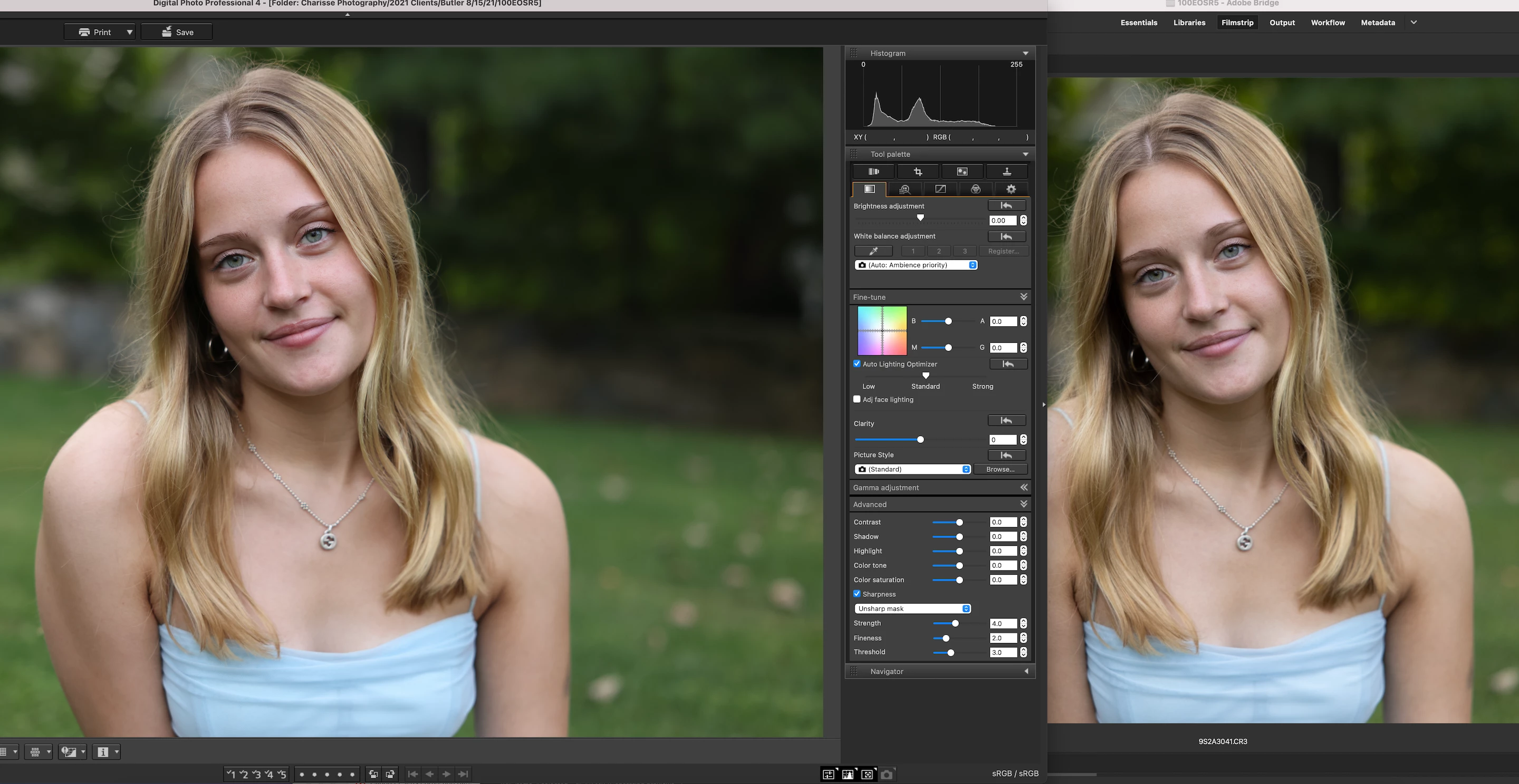Here is a side by side right now of the same raw file in Digital Photo Pro 4 (left) and Adobe Bridge (right). The photo on the right is missing color...look at her skin and lips.