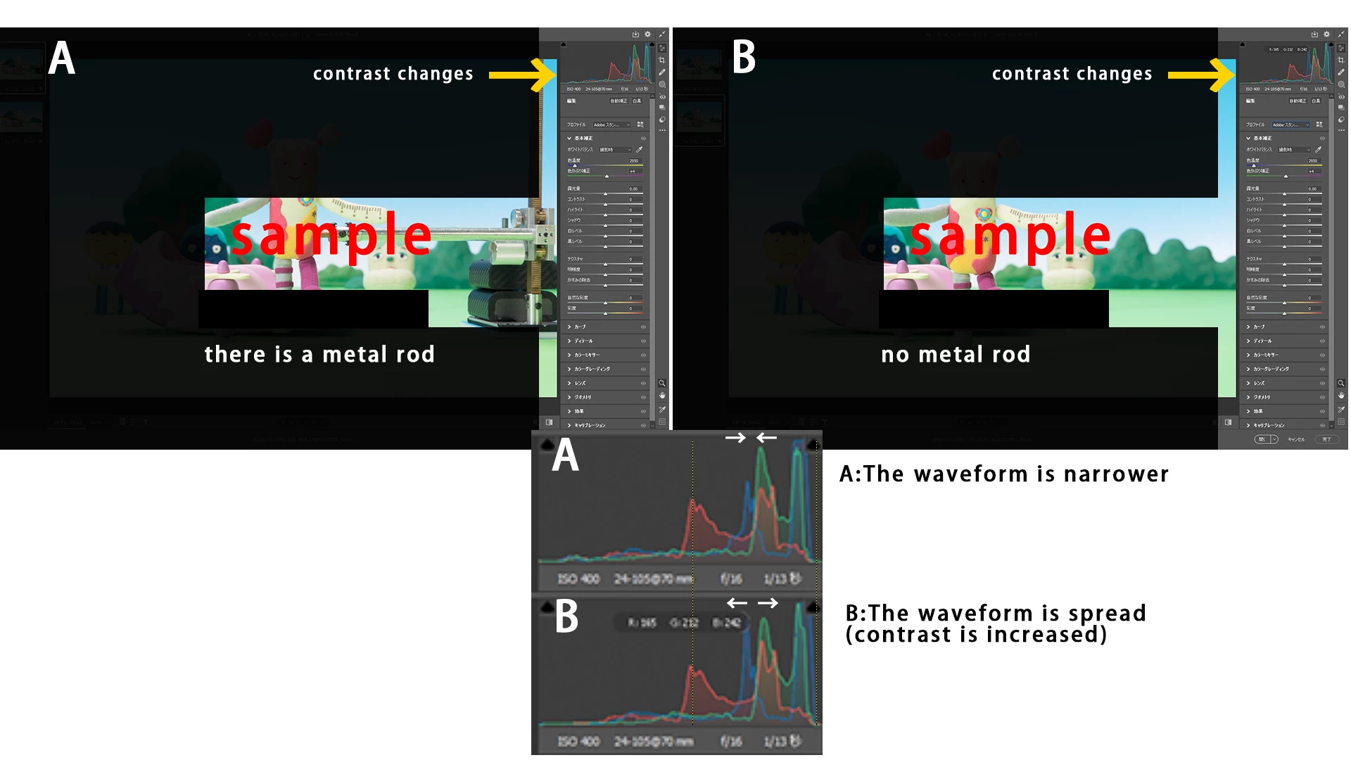 The contrast changes depending on whether there is a strong highlight metal bar on the screen or not.This phenomenon does not appear in Jpeg, but it appears in the default state when raw data is opened in camera raw.