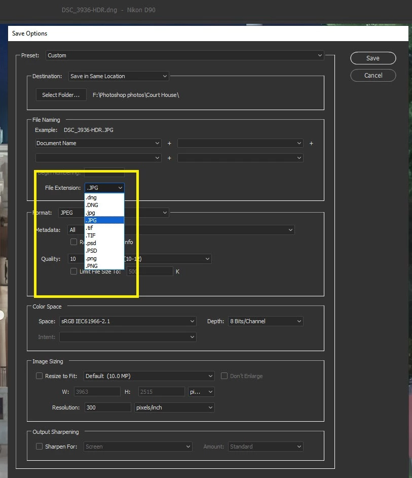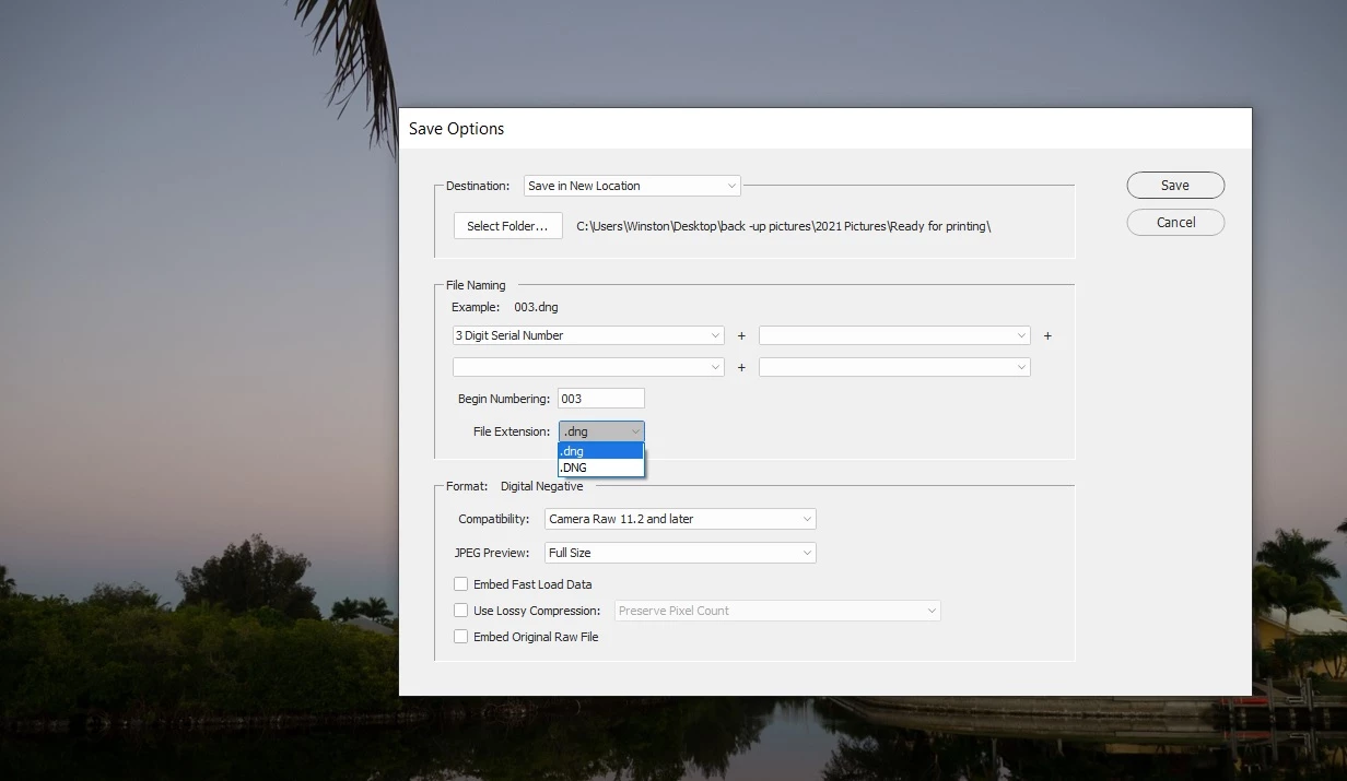 I can only save files as .dng under file naming. I would like to save processed files as jpeg. Any work-around would be appreciated to accomplish saving the files as jpegs