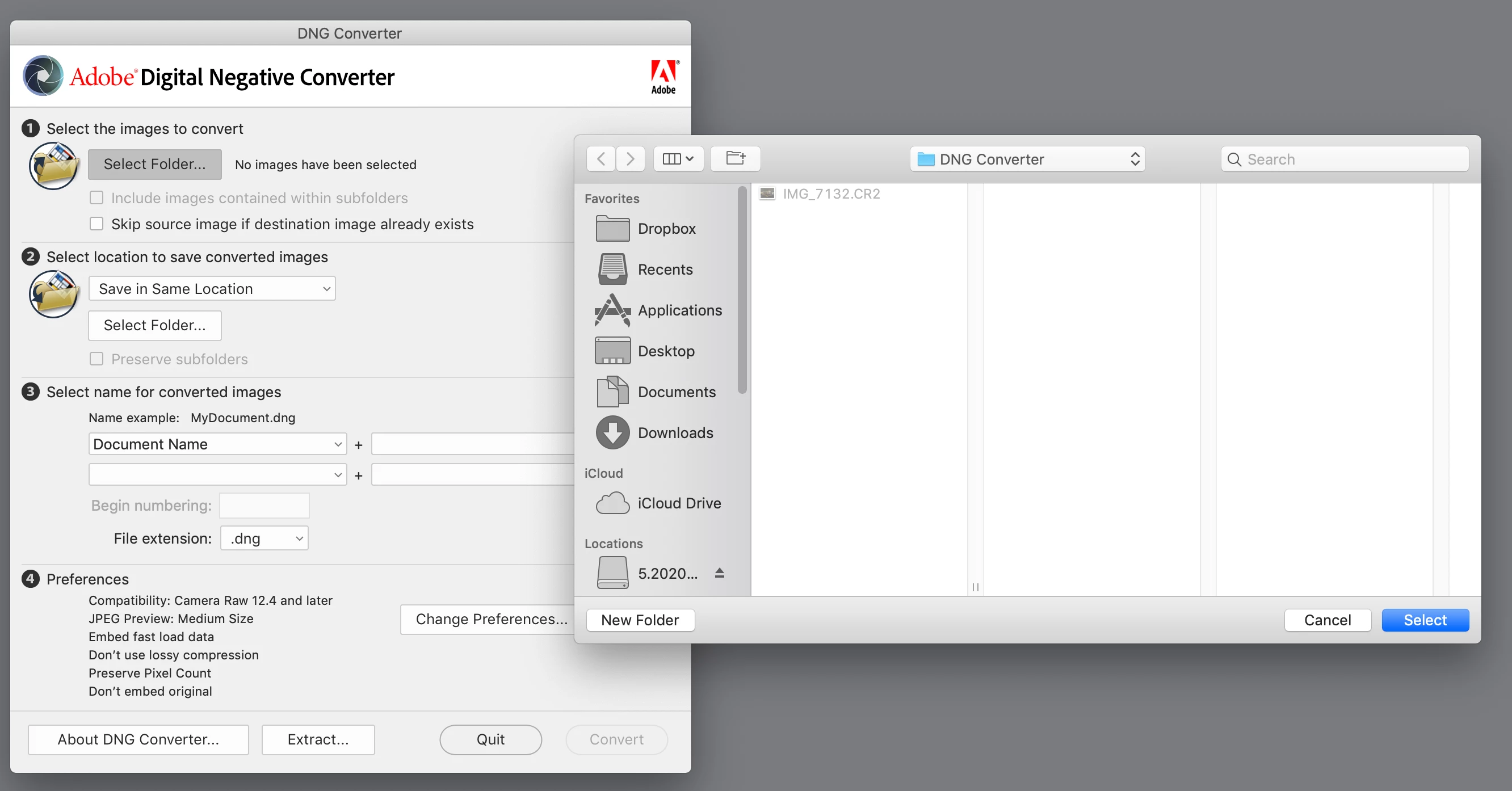 I have a 2019 iMac with a 3Ghz Intel Core i5 processor and OS 10.14.6. Today I downloaded several versions of the DNG Converter from Adobe's site and from link's in the community discussions, but none resulted in a program that recognized my raw files by the DNG converter. I'm mostly trying to convert Canon 70D and Powershot G7 X Mark II files. All my raw files are grayed out. I've tried restarting the computer and changing the file locations, but they won't open.
