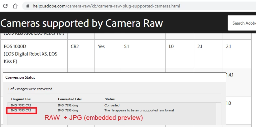 DNG converter gives 'unsupported raw' with CR2+JPEG (embedded preview) from EOS1000D