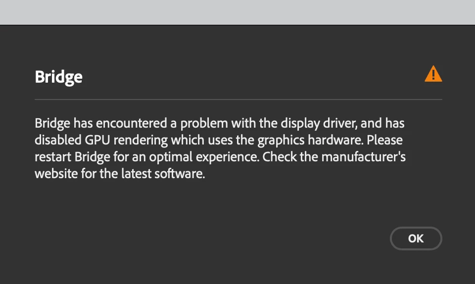I am in an intel Mac Mini with an ePGU. Mac OS Sequoia 15.3.1 using the BlackmagicdesignRadeon 580 eGPU. Photoshop 26.3. Bridge 15.0.2. Camera Raw 17.2