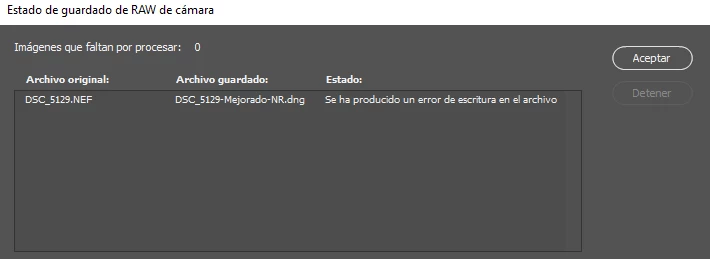 Hola, cada vez que intento utilizar la herramienta de reducción de ruidos en Photoshop con camera row para mis fotos, al final del proceso aparece el mensaje ''Se ha producido un error de escritura en el archivo''. No sé como solucionarlo, actualicé las aplicaciones, instalé nuevamente el Photoshop y aun así no se soluciona.
