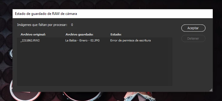 Hola, estoy teniendo serios problemas con Camera RAW: no exporta las imágenes (adjunto captura) y no guarda la selección que hago, es decir, abro muchas imágenes con CR, elemino algunas, doy clic en "Hecho" pero no guarda la selección pero si la edición.