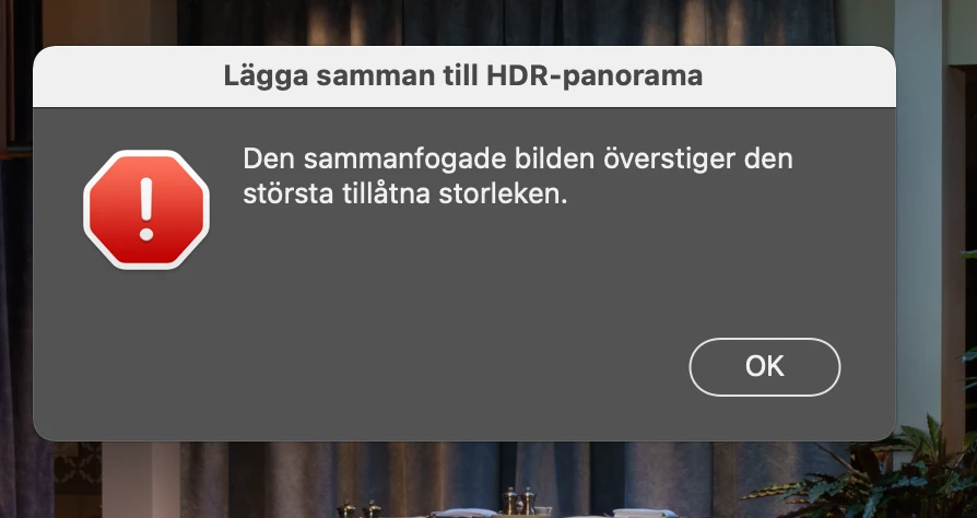 When I in Camera Raw trye to merge 6 raw files to a HDR-Panorama file I get the following error message, thet the merged oicture exceeds the biggest alowed file size. I never had this error on my older macbook pro with older camera raw. The exact same raw files (sony A1)