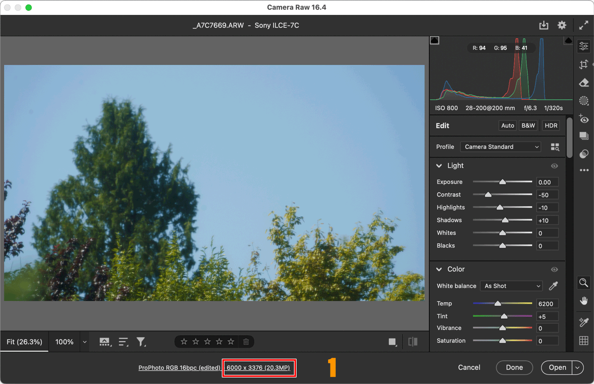 3. You can see at the bottom that after applying Reset to Full, the pixel dimensions of the current crop now report my full 6000 x 4000 px (3:2) camera sensor area.