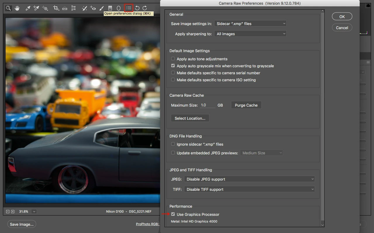 Hola, anda a las preferencias de Camera Raw y activa utilizar el procesador gráfico