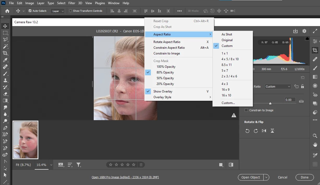 I edit portraits constantly. The default aspect ratio for the crop tool in Camera Raw is "Custom". How can I change the default aspect ratio to 8x10, not just for this image, but for all editing from here on out? As it stands I have to select 8x10 for every image I crop, and that just slows down my workflow. It would be easier to select crop and have it set to the aspect ratio I need. Thanks!