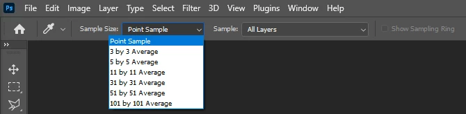 In Photoshop, you can choose the sample size of the color picker — point sample, 3x3 average, 5x5 average, 11x11 average, etc. But I've never seen how to figure out what the sample size is in ACR. Can someone please show me where to check the sample size and change it, if possible? Thank you.