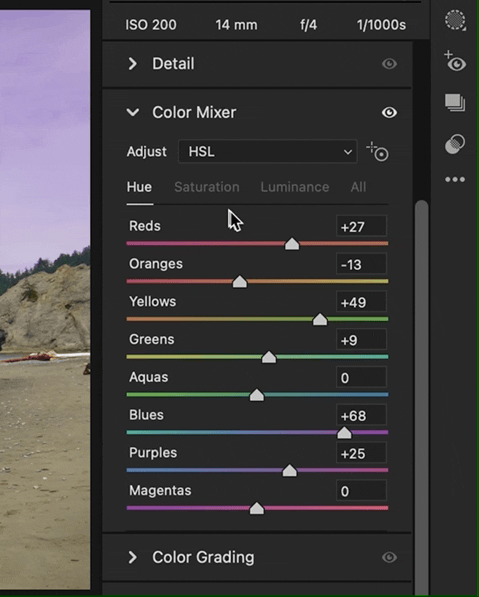 For example, I set saturation, hue and luminosity for different tones in an image, but later I decide I want the original settings - only in the color mixer, not all ACR image settings. How do I set all tones to zero without moving each arrow to the middle?