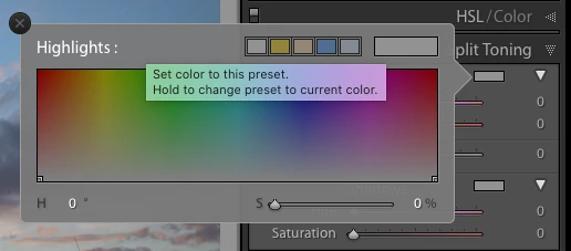 How to select a colour in ACR's split toning panel