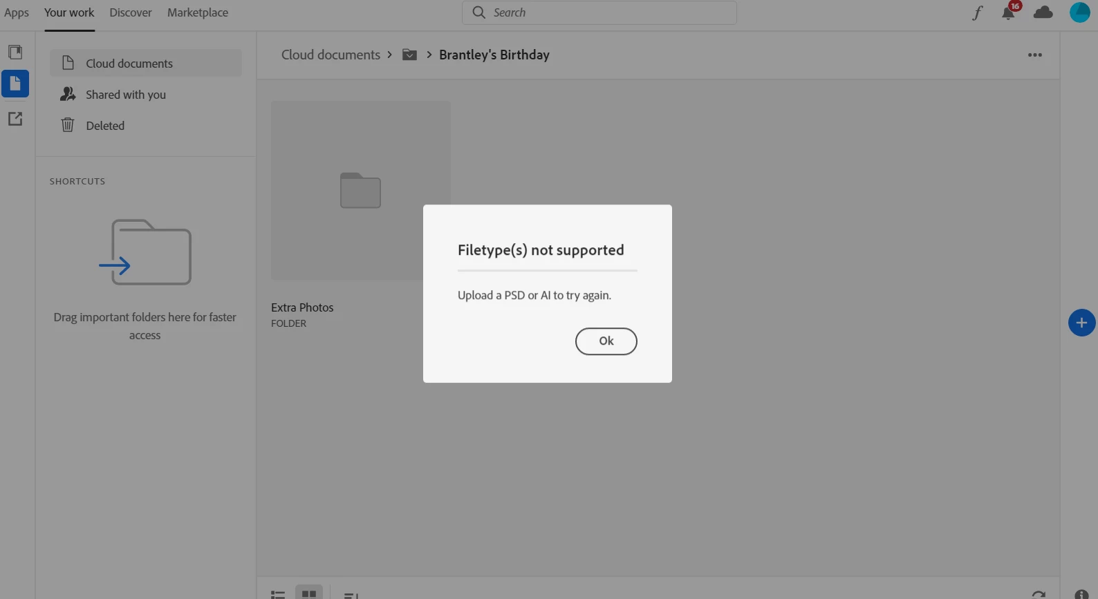 Need help. Trying to upload my raw images to Adobe Cloud but it won't allow me. It says file not supported, please upload a PSD or AI file....??? Need some help with this please. I was told Adobe cloud can be used as storage for my photos and video too.