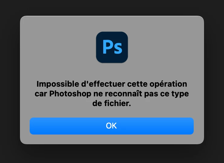 Impossible d'effectuer cette opération car Photoshop ne reconnaît pas ce type de fichier.