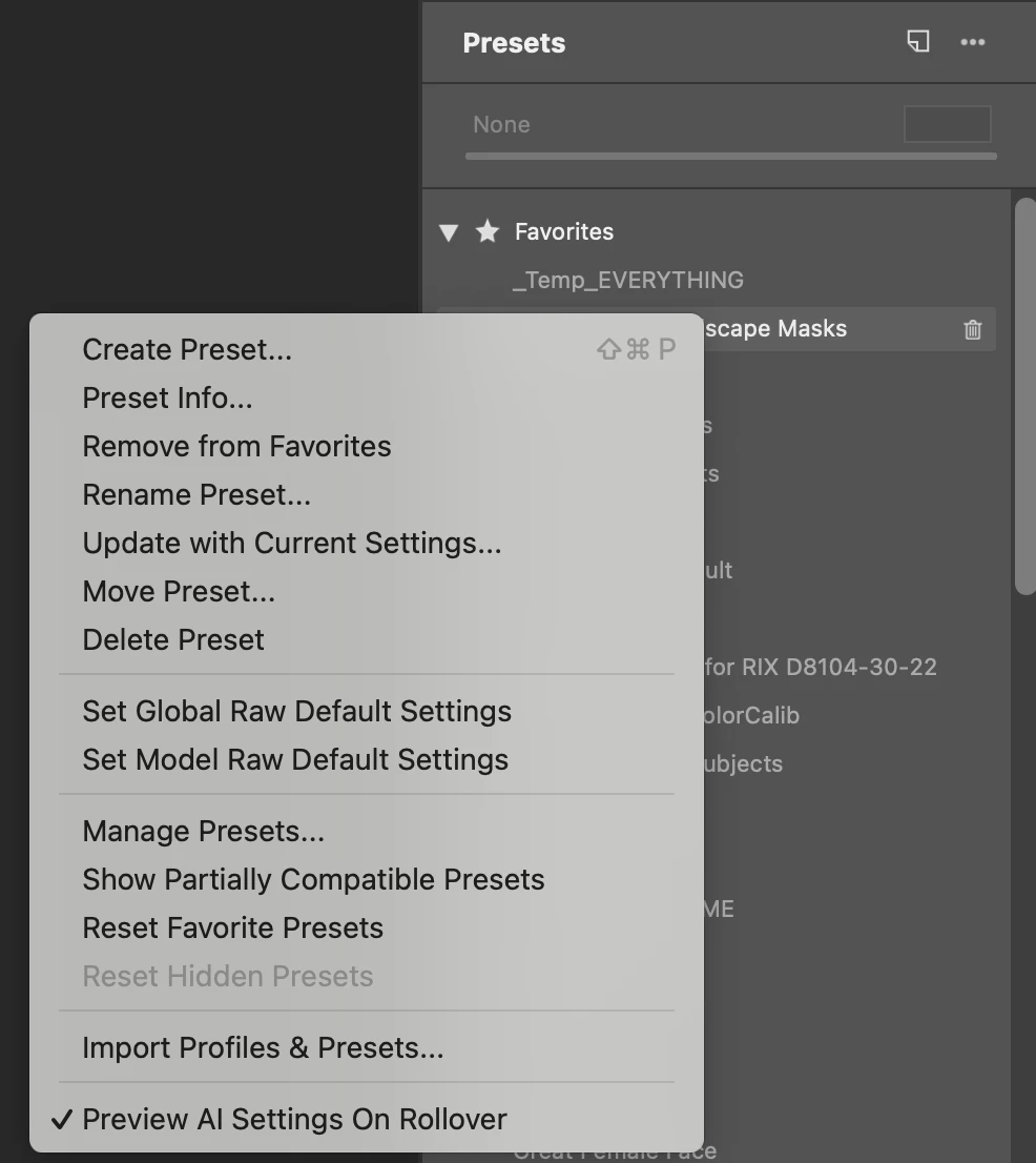"These two commands are shortcuts for associating the clicked preset with raw defaults.  The first command (global) is for all cameras.  The second one (model) is for the current specific camera model."
