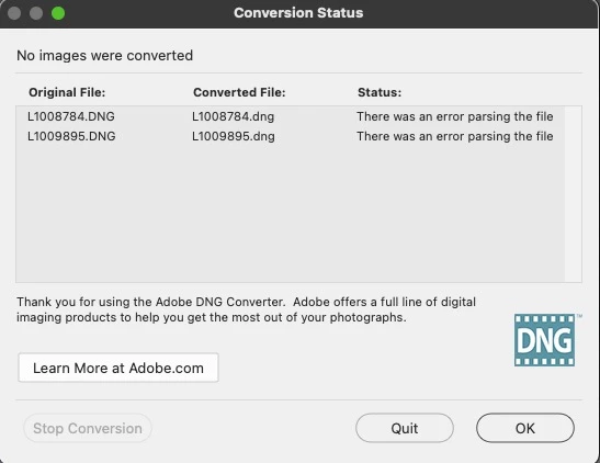 Individual DNG file not opening in camera RAW does not recognize type of file