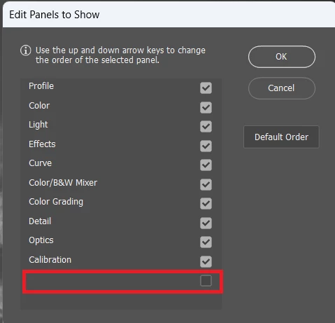 The Lens Blur panel is stuck at the top of the panel bar and and can't be moved or removed. When opening the Edit Panels dialog to try to move or remove it, it shows at the bottom without a title and moving or unticking it has no effect.