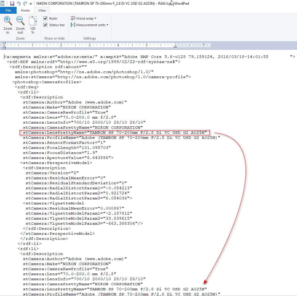 Here is what the LensPrettyName name/value attribute pair looks like in WordPad for the profile without the TC. Notice there are multiple instances of the pretty-name. I'm not sure if you need to change them all or if it'll just use the first one. I guess that's something to experiment with. Once you get it displaying short enough, then you can use a search/replace in the text editor to change the remaining lines. You can also change the first part of the next line down, ProfileName but put your name instead of Adobe at the front. I'd leave the rest of it the same for reference. Also it won't do too much good to change the one in the ProgramData folder because they can be overwritten by a subsequent install so it's safer to put them over in the Users area. Also make sure you don't use too fancy of an editor because you want just the plain text saved back out to the LCP file (i.e. as a .TXT file) not with RTF or DOCX formatting hints.