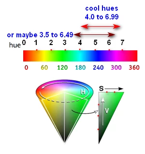 In general, hues are given in degrees from 0 to 360 representing red, orange, yellow, green, blue, purple, back-to-red. What are "cool colors"? They are the cyans, blues and purples.
