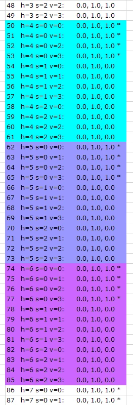 All that is somewhat easy to understand. The difficulty is understanding what rows in the look table correspond to what colors in the rainbow-strip and HSV-cone in the illustration, above.
