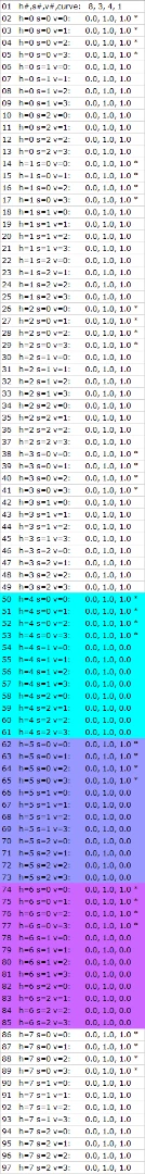 To determine this, based on the pseudo-code in the PDF, I wrote a C# program in LINQPad 5 to output not only the rows of the looktable.csv but also the corresponding HSV color-segment numbers, where the Hue segment numbers go from 0 to 7 (8 segments), the Saturation-segment numbers go from 0 to 2 (3 segments) and the Value segment numbers go from 0 to 3 (4 segments).
