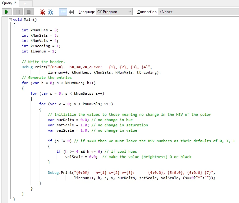 Here is a screenshot of my C# code in LINQPad. It didn't make sense that the pseudo-code had the v segment numbers at 1 instead of 0 like the h and s segment numbers, and it didn't make sense to do something when v was 0 so I left that out as well: