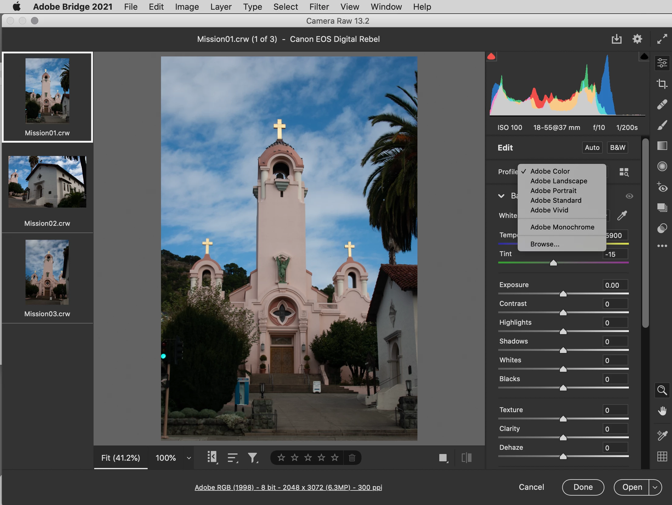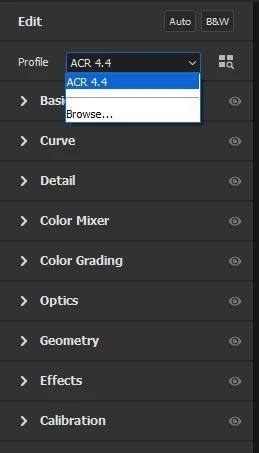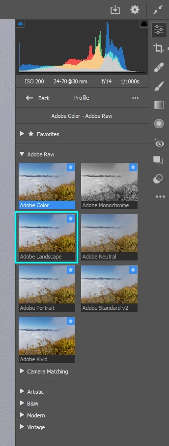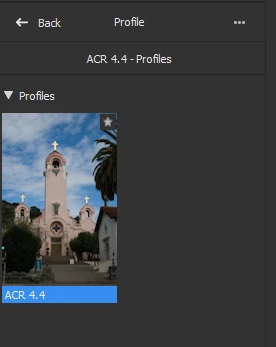 In particular, the text is requiring me to select a specific Camera Raw profile that doesn't appear to exist anymore. The text is asking for me to select the "Adobe Landscape" profile. However, when I click the dropdown for the profiles, I see this: