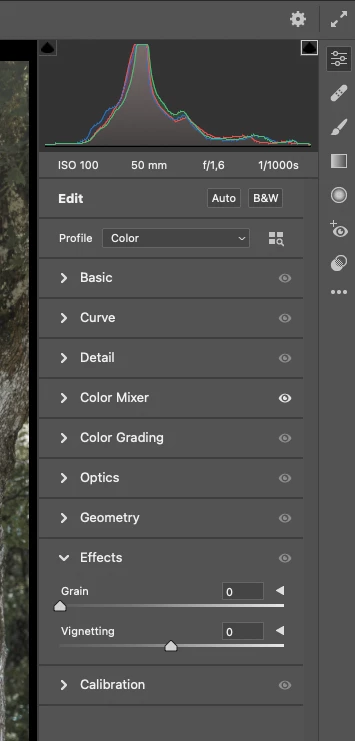 Expand the Disclosure Triangle to the right of the Vignette value.