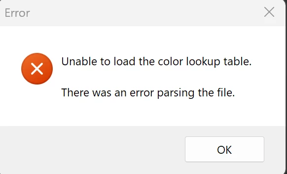 Trying to create a new profile in Camera Raw. When selecting a .cube file I get the attached erorr. The file works in other software.