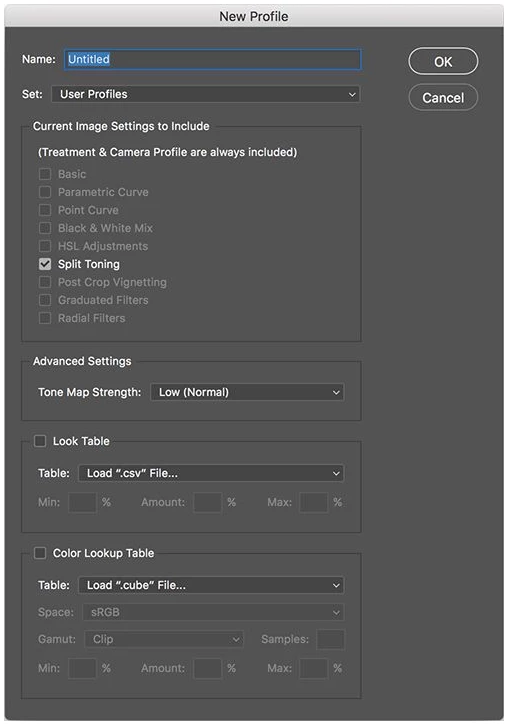 "New Profile" dialog box / Import Color Lookup Table