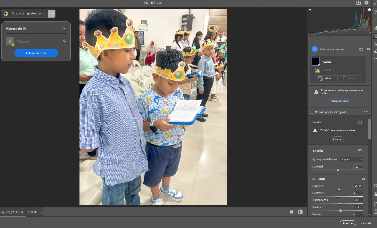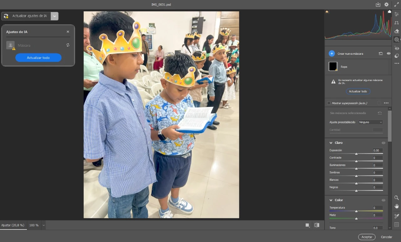 No puedo aplicar mascara en camera raw porque me dice que debo actualizar ajustes IA