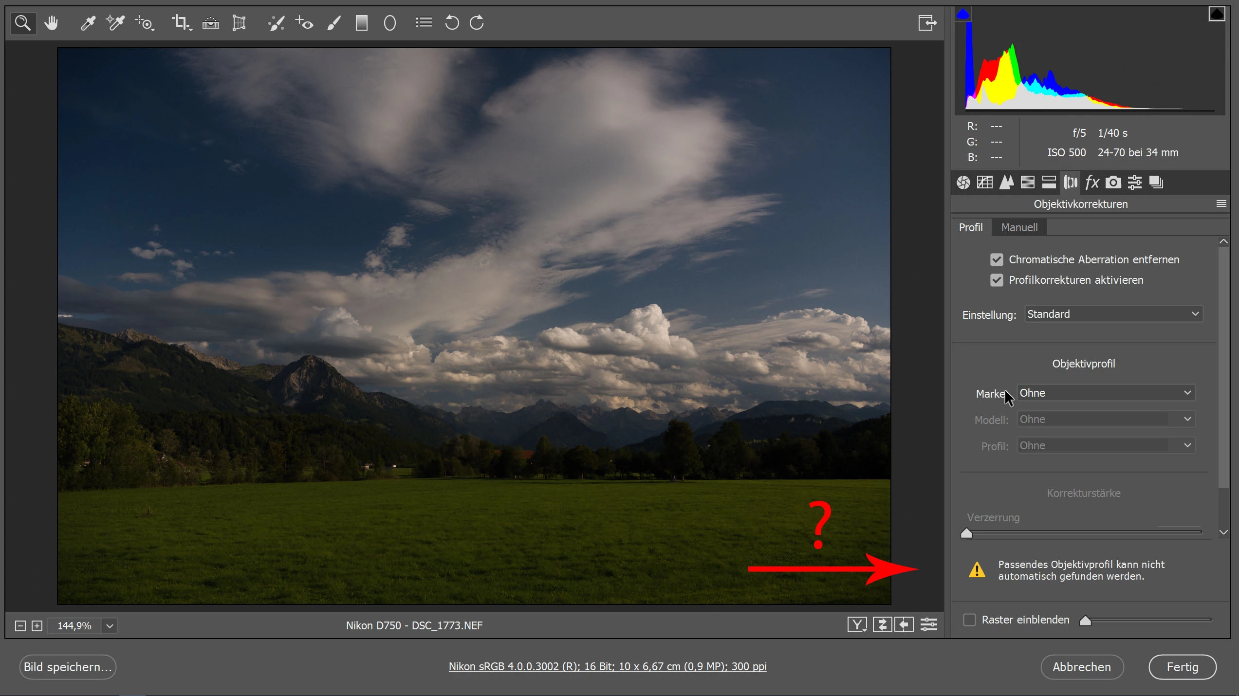 ich habe immer wieder das Problem, dass nach dem Öffnen einer .raw Datei aus Bridge in Camera Raw dort die Lens Profiles nicht mehr da sind. Unten im entsprechenden Reiter steht dann "Passendes Objektivprofil kann nicht automatisch gefunden werden" (siehe Screenshot 1).