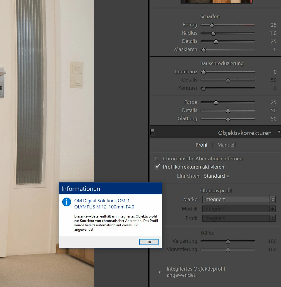 Olympus OM-1, no optical corrections when converted .DNGs are processed in Lightroom 6