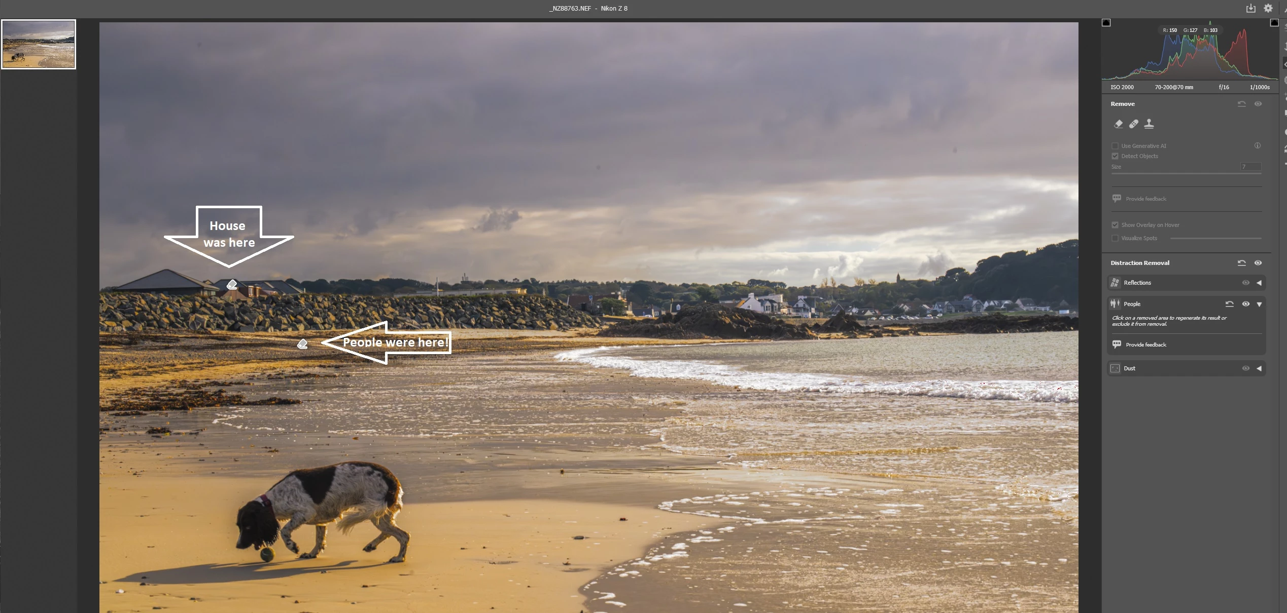 Remove distracting people doesn't know the difference between people and a house! Yes, it selected two distracting people, though as they were about half a mile away in the distance, I wouldn't call them distracting. Nice job.
