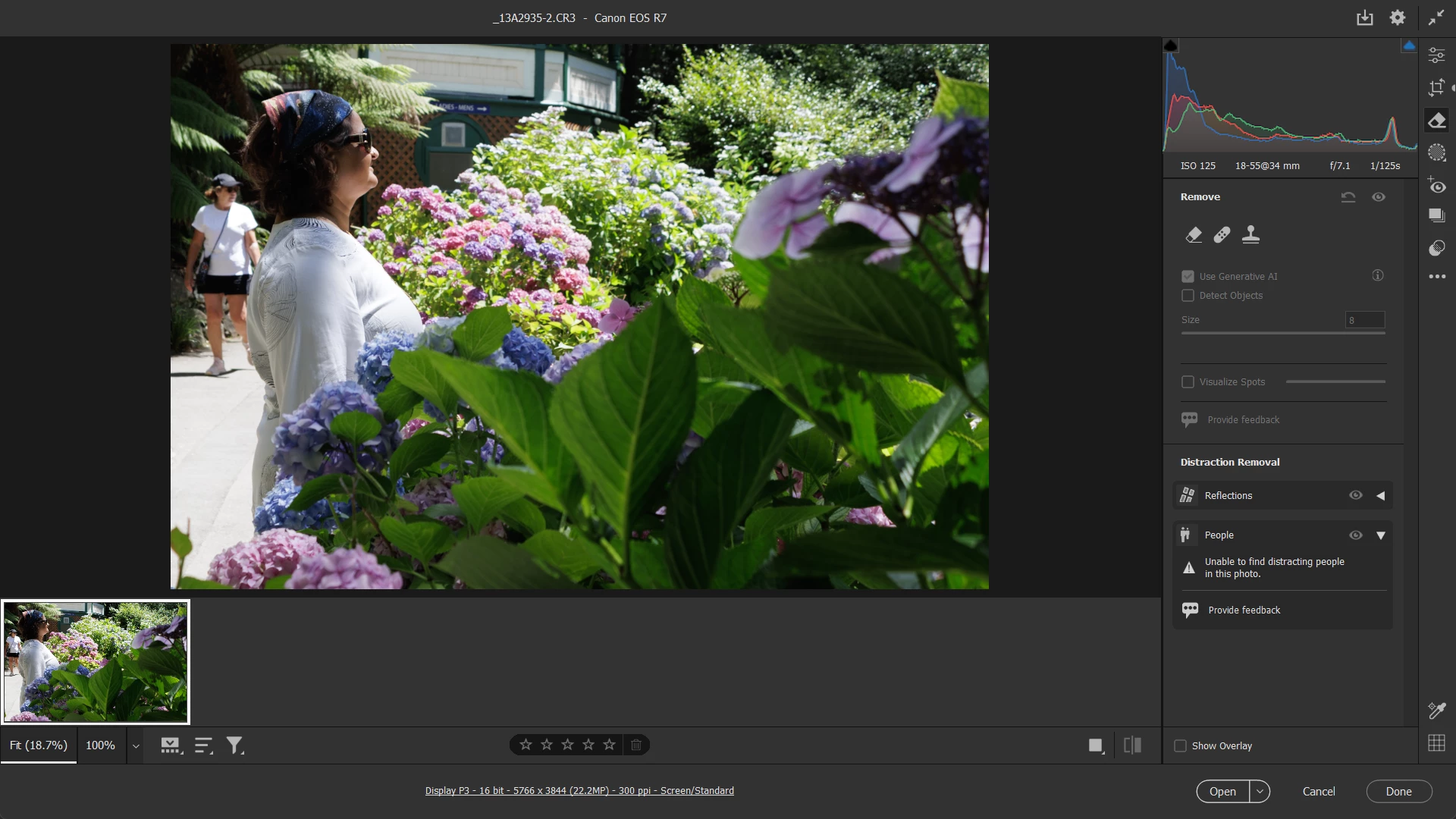 I just tried using camera raw. It failed. it came back as unable to find distracting people.