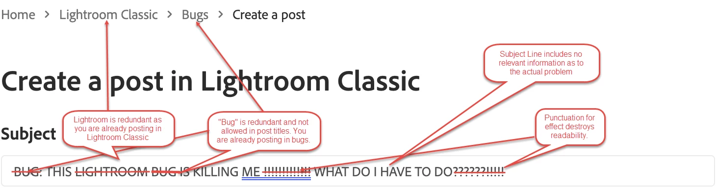 Eliminating redundancies: The words ‘bug’ and ‘Lightroom’ should be left out. They consume limited space and are already contained in the header at the top of the forum. You are in the Lightroom Classic space and have chosen to post in Bugs instead of Discussions or Ideas, so it isn’t necessary to restate that.