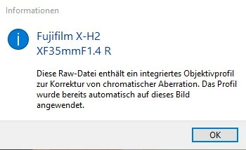 Wenn ich ein Foto vom XF56mmF1.2R in Lightroom importiere, kommt die Meldung "Passendes Profil kann nicht automatisch gefunden werden".