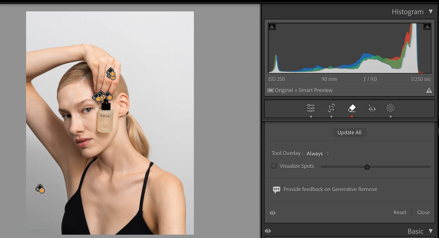 The heal, remove and clone all need separate toggles so that the history doesn't affect all spot removal.  Currently you can't clone, remove and heal in one image.  It's all heal, all remove or all clone.  Not ideal.