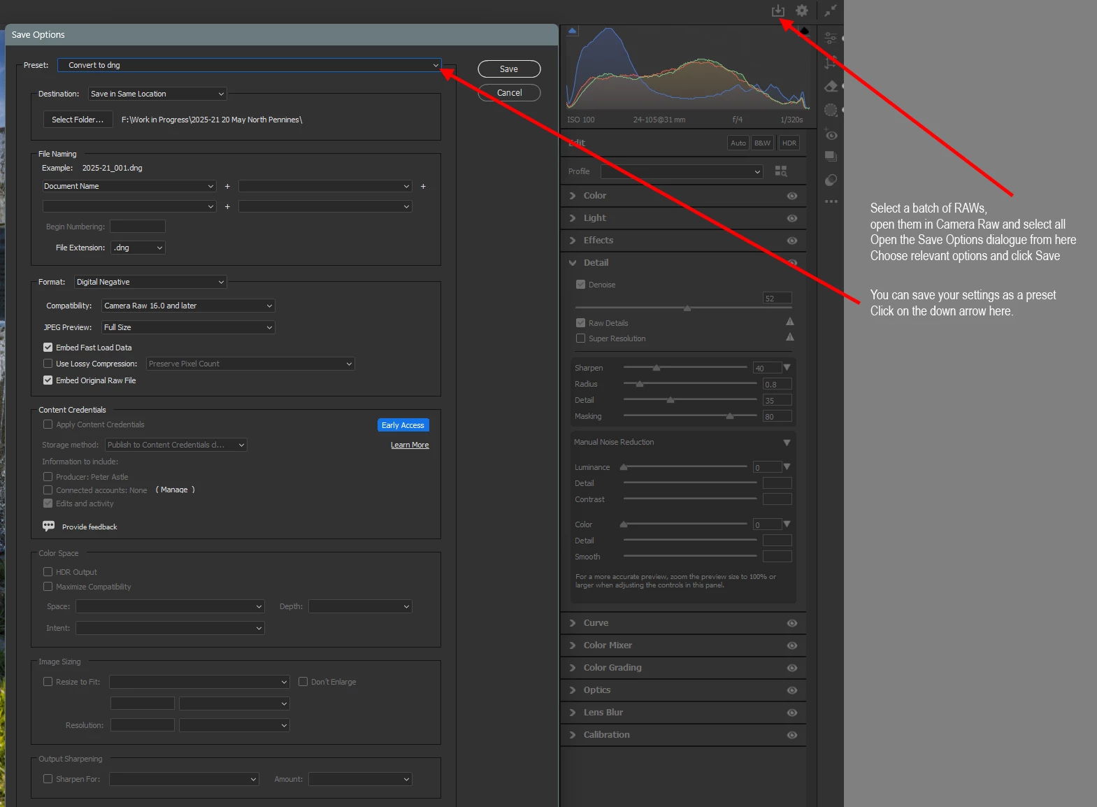 The reason to do that, its always much better to work on DNG files for me. That option creates a Denoise for all the selected photos according to selected sharpening and denoise value (Screenshot 2)