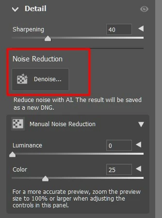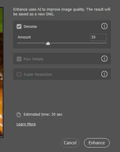 3. Denoise option do not create seperate DNG file instead it creates .acr file on file directory.